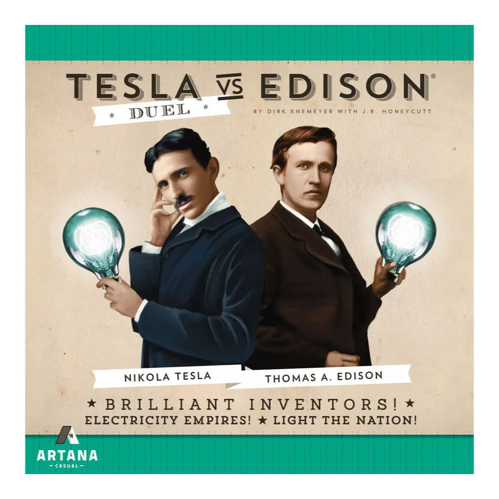 Tesla vs. Edison: Duel is a 15-30 minute two-player card game that brings the "War of Currents" to light in an easy-to-learn, fast-playing, but seriously strategic game. Players take control of Nikola Tesla or Thomas Edison and build a company that claims projects in regions around the United States, advance the latest technologies, engage in a propaganda war around AC and DC technologies, and buy stock shares in smaller electricity companies. During the game, players bring famous luminaries of the time that each offer unique actions and abilities into their company. The winner is the company that wins two of the three main systems: controlling regions with projects, being ahead in the PR race, and holding the most valuable stock portfolio. Tesla and Edison each have a special auto-win condition that players can trigger during the game to win right away.