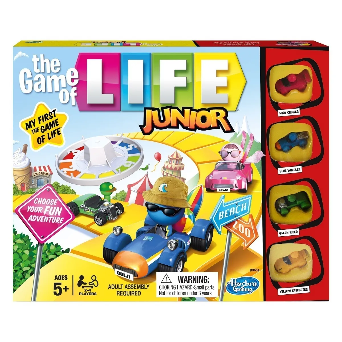 Choose your fun adventure with The Game of Life – junior style! This fun and fast-paced game is just like the adult version, but with much cooler rides! Pick the Blue Wheeler, the Pink Cruiser, the Yellow Speedster or the Green Rider, and start enjoying life’s twists and turns! Have tons of fun with amazing adventures on the beach or at the zoo – it’s your choice! Keep collecting stars and see how the Action cards and Attractions like the Museum or the Chocolate Factory affect your fate. If you get to 10 stars first, you win! You’ll have a fun game and an awesome day whenever you play The Game of Life Junior game! The Game of Life Junior is an easy, fun way to start playing The Game of Life Easy to set up and play Action cards and Attractions change your path Collect 10 stars first for the win.