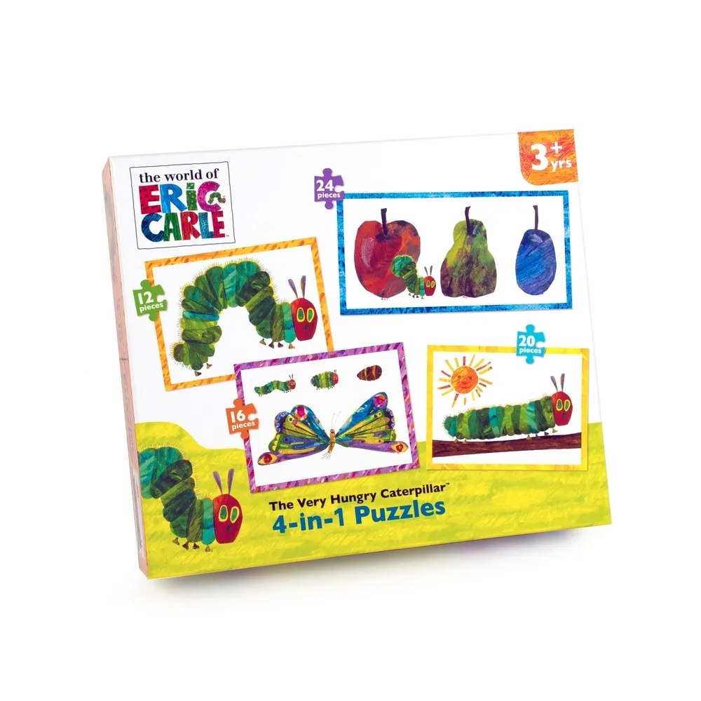 Four lots of fun in one box! Little ones who love Eric Carle’s timeless classic The Very Hungry Caterpillar will enjoy hours of fun with this colourful Very Hungry Caterpillar 4-in-1 Puzzle set. Created to entertain and engage children aged three years and up, The Very Hungry Caterpillar Puzzle set contains four vibrant jigsaws of 12, 16, 20 and 24 pieces. The four puzzles each feature a different image including: The Very Hungry Caterpillar in the sun, The Very Hungry Caterpillar with some of his favourite fruits and as well as the lifecycle of the butterfly. Each of the four bright and bold puzzles are fun, colourful and perfect to encourage independent as well as group play for preschoolers. Puzzle construction also encourages hand-eye coordination, concentration and problem solving in little ones. The Very Hungry Caterpillar 4-in1 Puzzle Set is the perfect birthday and Christmas gift, and is also a great way of keeping children entertained on rainy days and during school holidays. The puzzles are presented in a colourful illustrated sturdy box for easy transportation and storage. Suitable for age 3 years and over.