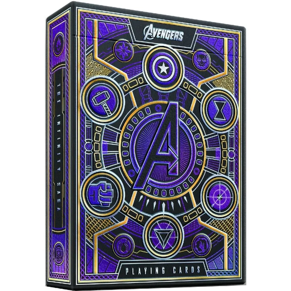 The box features iridescent, cosmic foil shimmers at every angle. The cards feature custom artwork in every aspect of the design, with the Aces, Jokers, box design, and court cards inspired by fan-favorite characters: Iron Man, Spider-Man, Captain America, and Black Panther.