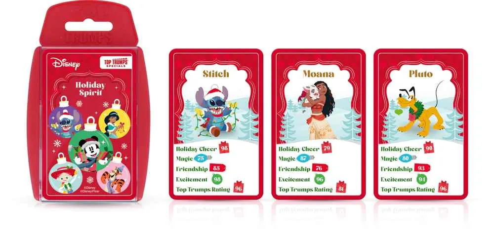 The classic Top Trumps card game gets a magical, festive makeover in this special Christmas holiday edition. Even during the season of goodwill however, you will need to outsmart your opponents as you discover new and exciting Disney facts on your way to the top! Find out whether the Holiday Cheer rating of Stitch or the Excitement Level rating of Belle will help you triumph and claim every card for your own! Featuring gorgeous artwork in a colourful design you will relive movie history whilst getting to know your favourite characters and their companions.