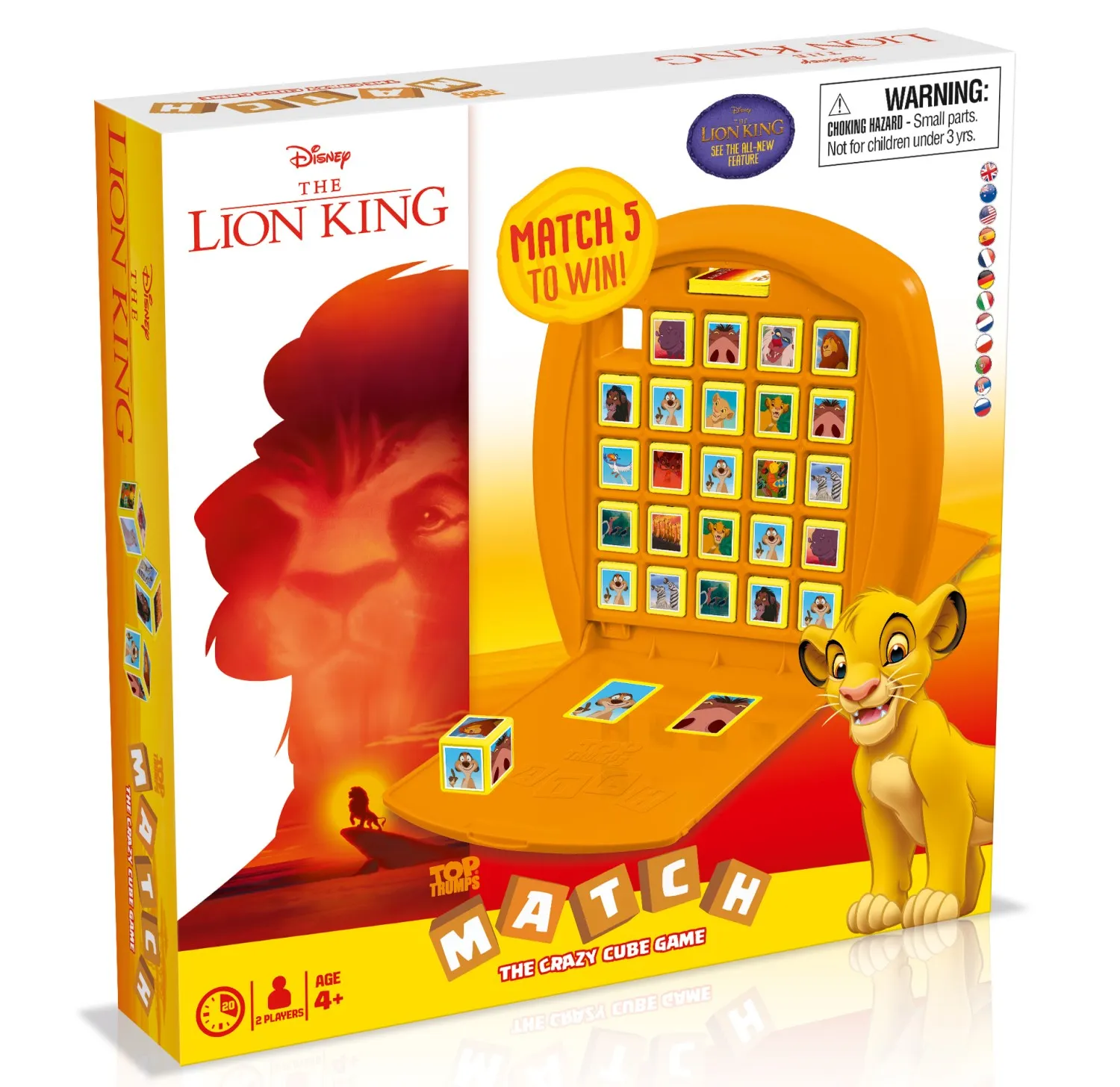 Everybody look left! Everybody look right! Everybody try and match 5 in a row with this brand new game from Top Trumps! Choose your character cube carefully and try to get 5 familiar faces in a row, whilst preventing your opponent from doing the same! There's 15 characters from the classic animated adventure, from Pumbaa to Nala, including the villainous Scar and the terrifying Hyenas, but can you use your kingly skills to get 5 in a row and Match your special Top Trumps card?