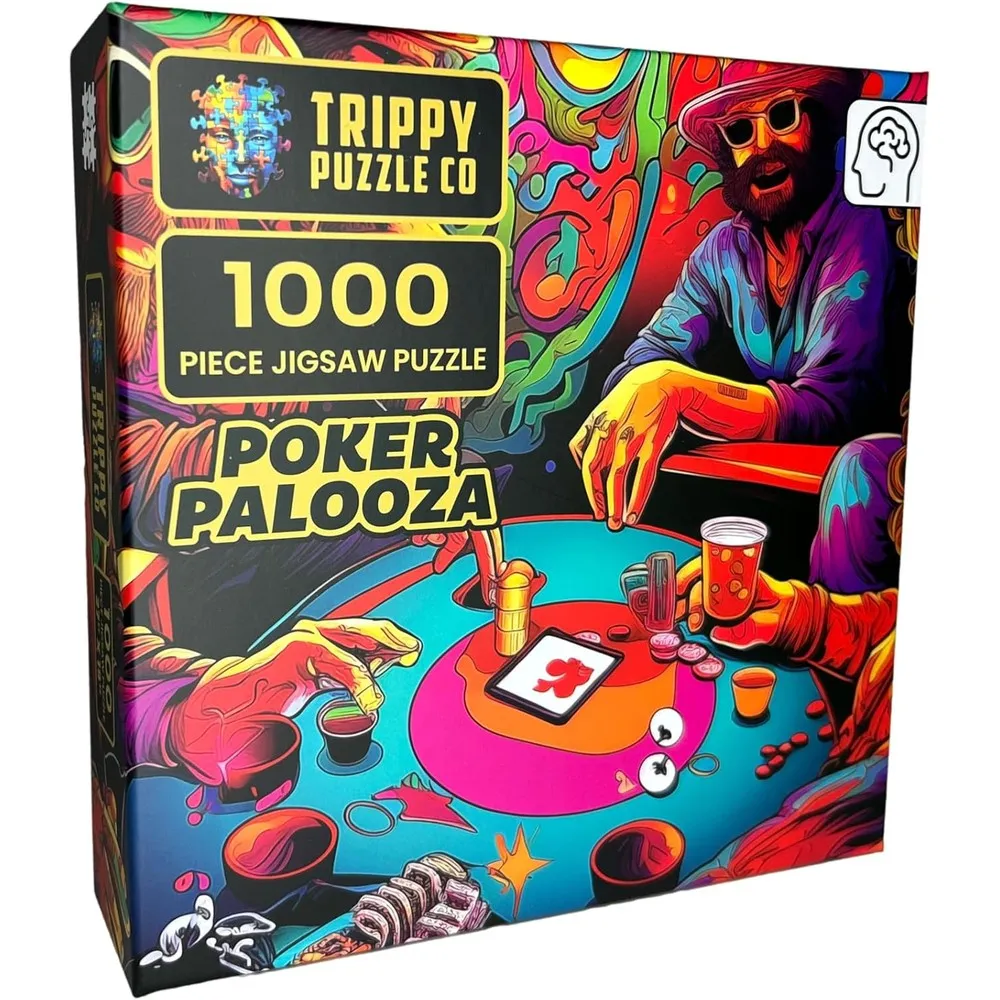 Immerse yourself in the eccentric world of Poker Palooza with this 1000-piece jigsaw puzzle. Featuring vibrant characters gathered around a poker table, with surreal, psychedelic colors and whimsical imagery throughout the scene, this puzzle offers a fun and mind-bending challenge. Perfect for puzzle lovers and poker fans, it provides hours of entertainment.