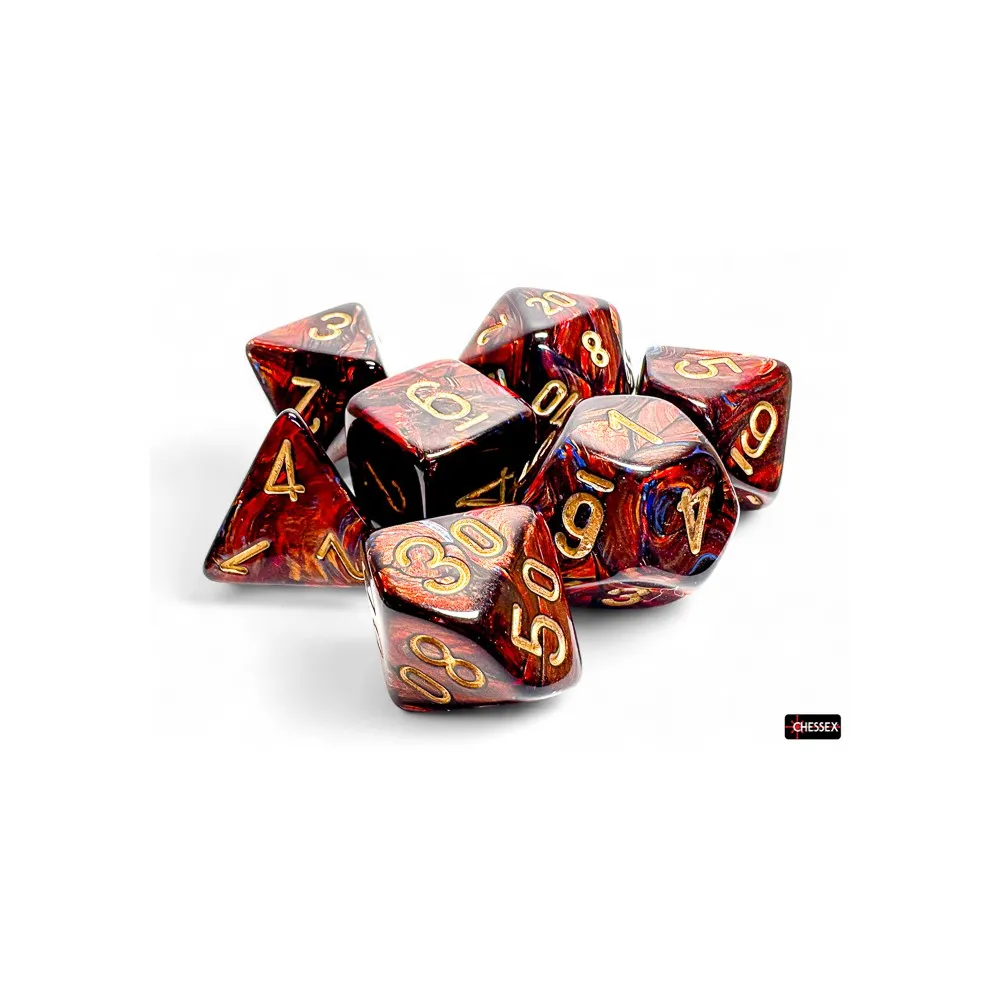 Contains 7 Scarab Blue Blood™ Dice with gold numbers in the following Shapes: