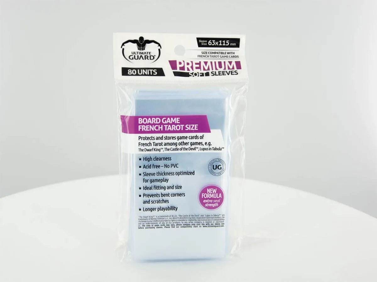 Protects and stores game cards of French Tarot among other games, e.g. The Dwarf King™, The Castle of the Devil™, Lupus in Tabula™! 80 sleeves per pack. High clearness The high clearness of the material ensures a genuine image quality with unaltered contrast and colors. Ideal fitting and sizeOptimal fitted sleeves for a safe handling and a great playability of your cards. Acid free, no PVC This product is completely free of PVC and acidic materials and therefore ideal for collectible cards. Longer Playability and lifetime The extra durable material prolongs the lifetime of your cards and keeps them playable, even during heavy use Optimized thicknessSleeve thickness optimized for gameplay Prevents bent corners and scratches Keeps your most valued cards in mint condition to preserve their value and usability