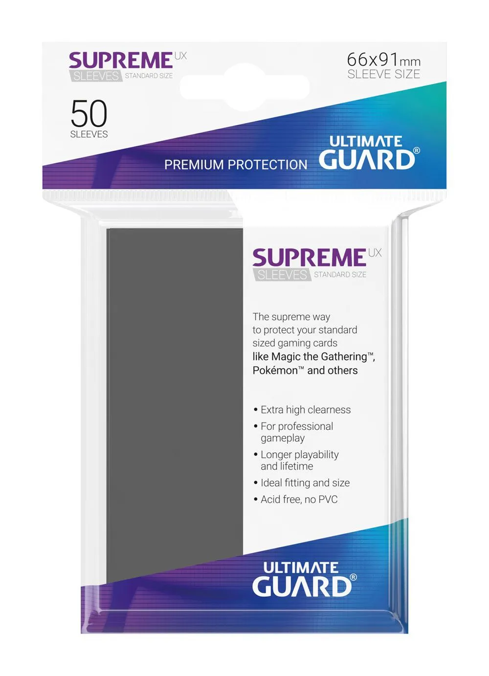 This pack contains 50 high quality card sleeves for all standard sized gaming cards, like Magic the Gathering™, Pokemon™ and others. - New formula: Extra seal strength - Extra high clearness - Acid free, no PVC - For professional gameplay - Ideal fitting and size for a perfect hold - Prevents bent corners and scratches - Prolongs the playability and lifetime of cards - Size of sleeves: 66 x 91 mm