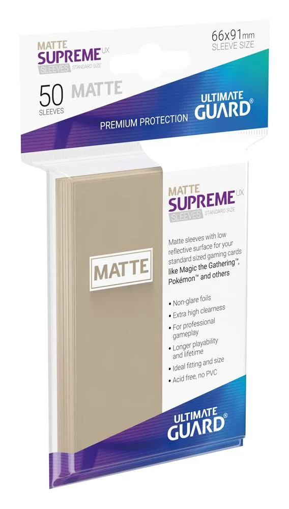 This pack contains 50 high quality card sleeves for all standard sized gaming cards, like Magic the Gathering™, Pokemon™ and others. - New formula: Extra seal strength - Matte sleeves, ideal for tournament use - Non glare / non reflective for professional gameplay - Easy shuffling - Prevents bent corners and scratches - Acid free / No PVC - Ideal fitting and size - Sleeve size: 66 x 91 mm