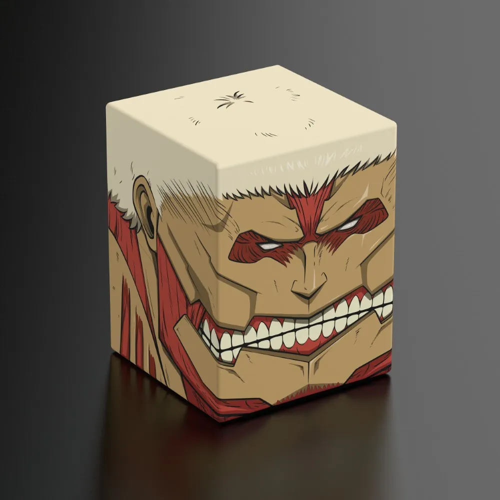 Collectible box for storing TCG decks, tabletop gaming accessories, and/or collectibles. The Armored Titan Squaroe from the Attack on Titan edition holds up to 100 cards in double protective sleeves if used as a deck box. Squaroes are made from 78% renewable resources and fit perfectly into the separately available Collectors Case (270832).