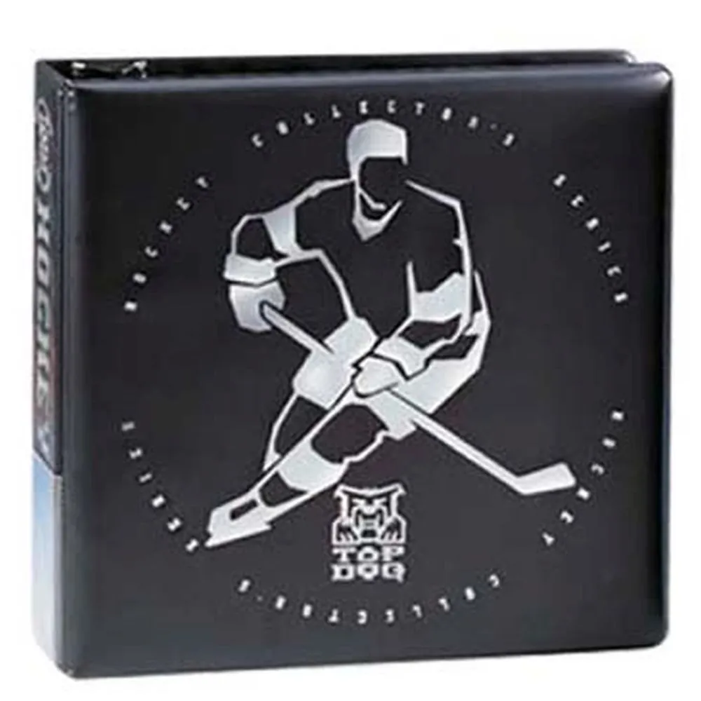 Premium album for standard size pages with Top Dog hockey themed hot stamp foil on black cover. Reinforced 2 inch D-ring with booster for quick loading of pages. Albums include rich foam padding. Constructed with clear indexing slot on the spine for easy organization.