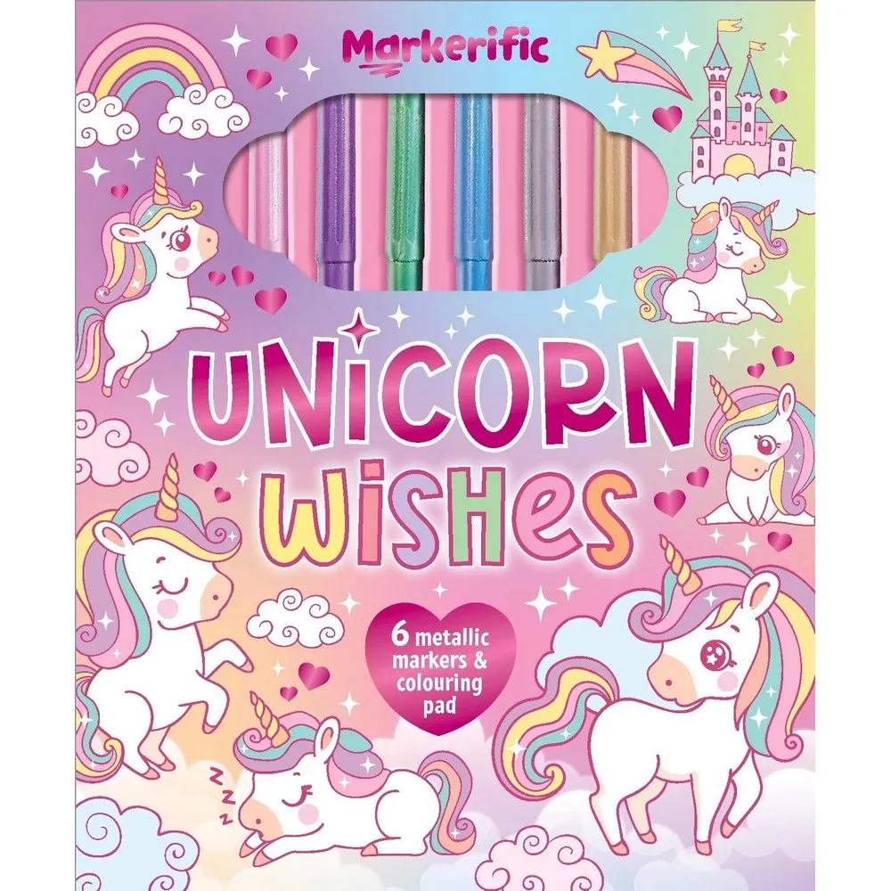 Metallic markers make colouring even more fun, and the colouring pad contains lots of unicorn artwork to colour and then display!