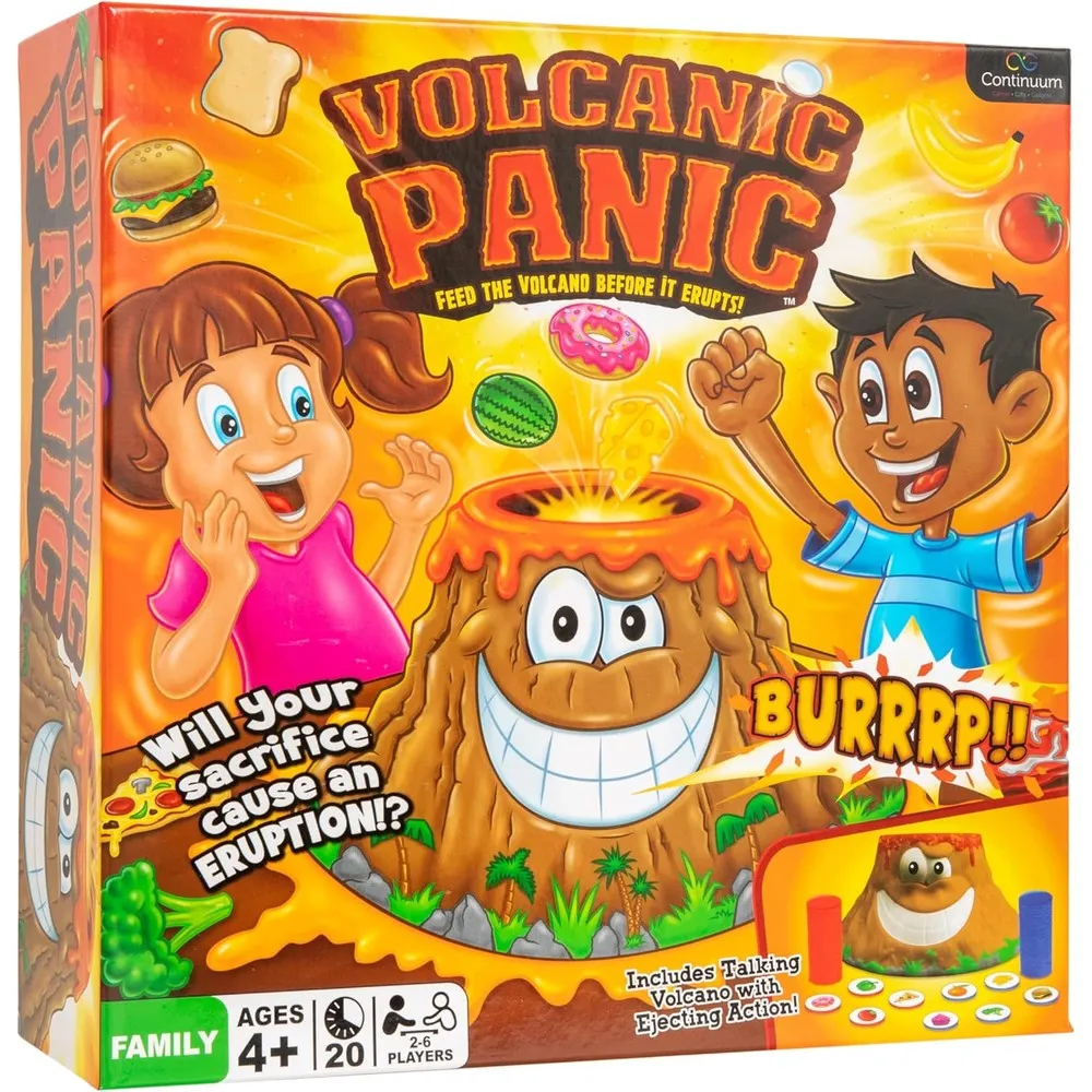 Details: A talking volcano with erupting action, tiles with pictures of food on them for matching. Board games for kids and adults ages 4 and older. 2-6 Players.