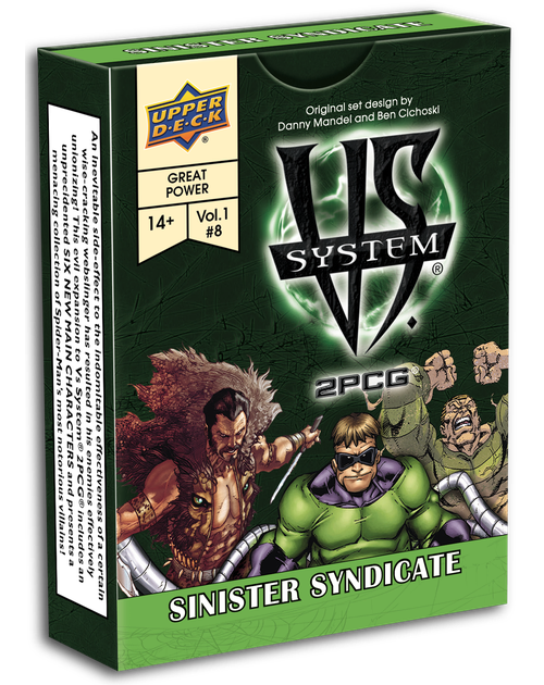 The second release of the Great Power Arc. An inevitable side-effect to the indomitable effectiveness of a certain wise-cracking webslinger has resulted in his enemies effectively unionizing! This evil expansion to Vs. System 2PCG includes an unprecidented SIX NEW MAIN CHARACTERS and presents a menacing collection of Spider-Man's most notorious villains! Vs. System 2PCG: Sinister Syndicate showcases 55 new cards that showcase Spider-Man's greatest foes. Including Main Characters, Supporting Characters, Plot Twists, and a Special Location. Vs System 2PCG: Sinister Syndicate can be combined with any other Vs System 2PCG sets. This is not a stand-alone game.