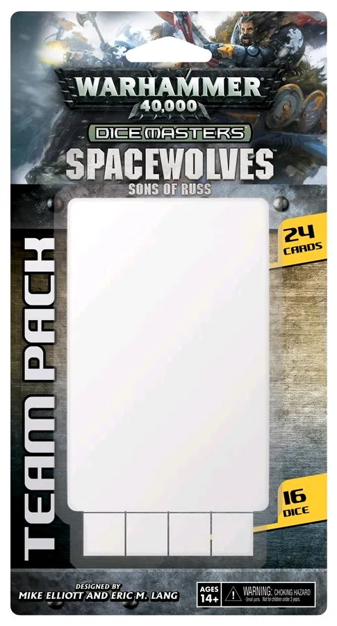 The Warhammer 40,000 Dice Masters: Space Wolves - Sons of Russ Team Pack is 100% compatible with Dice Masters. Quarriors! and Dice Masters are global hits from WizKids using the same proprietary Dice Building Game platform developed by Michael Elliott and Eric M. Lang. Warhammer 40,000 Dice Masters: Space Wolves – Sons of Russ Team Pack will leave you howling! The Warhammer 40,000 Dice Masters: Space Wolves - Sons of Russ Team Pack features iconic Space Wolves like Logan Grimnar and recognizable army-building pieces like the venerable dreadnought. The Warhammer 40,000 Dice Masters: Space Wolves - Sons of Russ Team Pack will let players build their own team of Space Wolves! This team pack is perfect for the Dice Masters veteran or someone looking to jump into the game fresh! This team pack can be paired with the Warhammer 40,000 Dice Masters: Battle for Ultramar Campaign Box to give a player everything they need to build a highly focused team for thematic play! With 3 different versions of each character, there are HUNDREDS of team building combinations! With 24 cards and 16 dice, this release will be sure to add some crazy fun to your Warhammer 40,000 Dice Game collection!