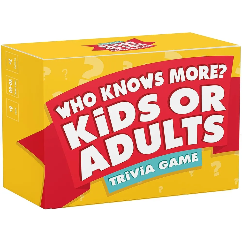 Who Knows More? Kids or Adults. Well this super fun trivia card game will give you the answer! Put on your thinking caps because it's time to find out if kids are smarter than adults in this fun and simple trivia game. With two sets of separate question cards for kids and adults. Collect points as you take turns answering fun trivia questions. First team to 20 points wins as you answer questions about history, science, pop culture and more! Watch out for those Think Fast cards, where you'll have just a few seconds to complete challenges for even more points to win the game. For kids 8+, teens and adults.