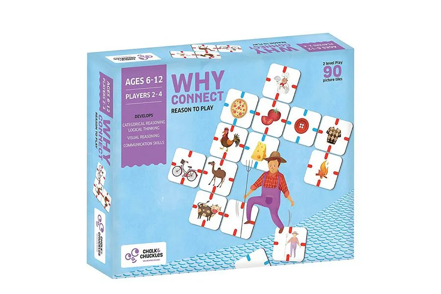 A highly addictive reasoning game that is not bound by a board and can be played anywhere on a flat surface. Players take turns adding a picture tile to the existing grid of logical connections. When adding a tile, the player must state aloud the reason for the connection (ie. "butterfly connects to airplane because both fly" or "sapling connects to chick because both are young members of their species"). The other players decide if they consider the connection logical and thus acceptable. If the players disagree with a stated connection, it cannot be played. The more connections a tile can make when placed, the more points it is worth. A tile that connects to one tile is worth one point, connecting to two tiles is worth five points, and three or four tiles connected is worth 10 points. The tile placed must logically relate to all the tiles to which it connects. Connections can be made based on function (used for, used by), sharing the same characteristics (color, shape, size, materials, etc.), "has-a" relationship ("train has windows"), causal reasoning (caused by, leads to), or reasoning based on science facts ("ball and feather both float on water" or "butterfly sleeps in blades of grass"). The game offers two levels of play. For an easier, faster game, play only with the 58 red tiles. For a longer, more challenging game, add the 30 blue tiles. Two magic wand tiles act as wild cards, becoming whatever the player names them to be when placed. The game ends when there are no more tiles to be placed and the player with the most points is the winner.