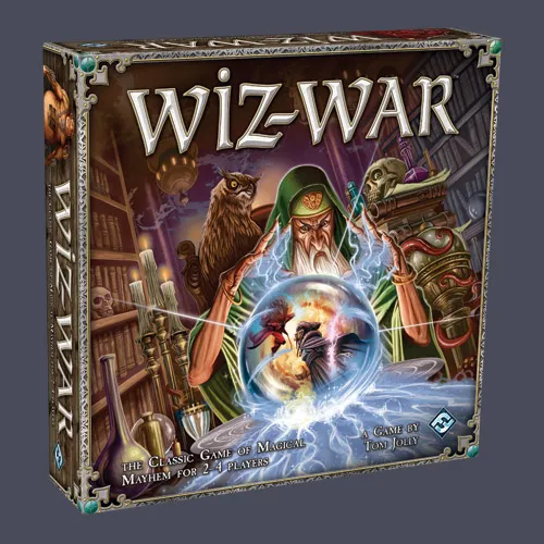 Wizards wage no-spells-barred magical duels deep in an underground labyrinth in Wiz-War. This classic board game of magical mayhem for 2-4 players pits players’ wizards against each other in a stupendous struggle for magical mastery. Win by stealing other wizards’ treasures and hauling them back to your base, or just score points by blasting the other wizards. The last wizard standing always wins. Created by Tom Jolly in 1983, Wiz-War has delighted players for decades with its light tone and fast, imaginative play. Now Fantasy Flight Games brings Wiz-War back, better than ever! Staying true to the spirit of the game that has entertained players for years, as well inspiring an entire genre of games, Wiz-War caters to the imagination and the funny bone. Casting an enriched array of spells, your wizards race through an underground maze, avoiding fireballs, werewolves, and psychic storms. Subtle game enhancements by Kevin Wilson and Tom Jolly promote faster play and clarify card effects.