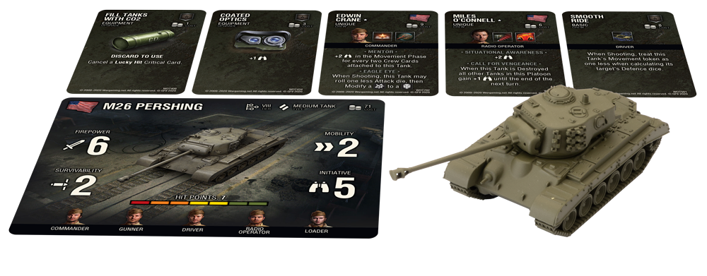 The M26 Pershing is remembered for being a Panther killer and as a Medium Tank it is all about offence, re-rolling a blank attack dice. Combine that with firepower 6 and the M26 doesn’t really need much in the way of upgrades. What are we saying, it was built for Smooth Ride (which allows you to reduce the penalty of moving when firing) and aggressive players that want to get the most out of this tank should look no further than commander Edward Crane who will grant you additional initiative in the movement phase for every two crew on the tank with his Mentor skill AND if you are feeling confident, gives you the opportunity to roll one less attack dice to modify a hit to a critical thanks to Eagle Eye.