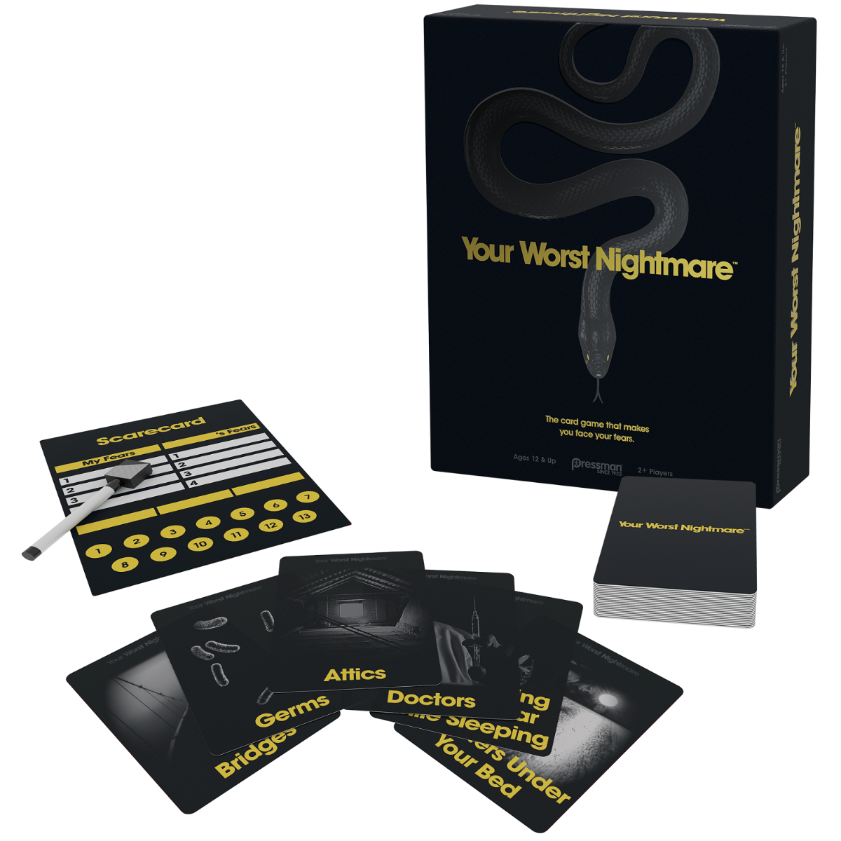 This is the first-ever card game that’s creepy and fun and designed to help people face their fears. To make this game, we carefully researched the things that scare people the most. Things like Flying, Death, Public Speaking, and Family Reunions. It includes 300 beautifully photographed Fear Cards that depict the scariest, and the funniest, fears you’ve ever seen or experienced. Up to four people can play at once—the winner is the first player to score (you guessed it) 13 points by correctly ranking the fears of the other players. You’ll discover entirely new aspects of your friends, family—even your significant other–that you didn’t even know existed. But best of all, Your Worse Nightmare spurs great conversations that help people start the process of facing their fears—because acknowledging and talking about fears is the first step to overcoming them. It’s the card game that turns fear into fun!